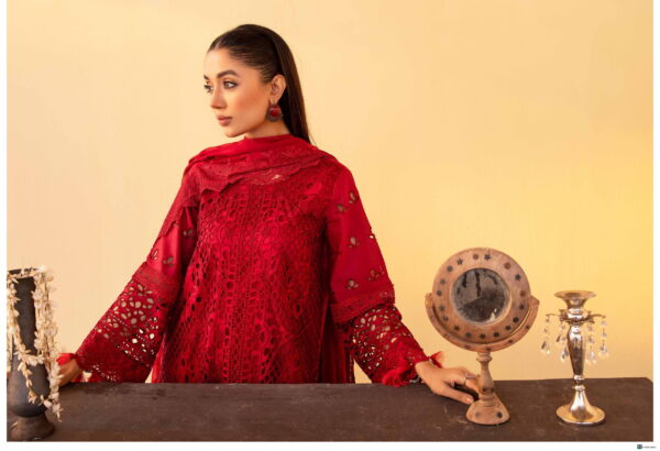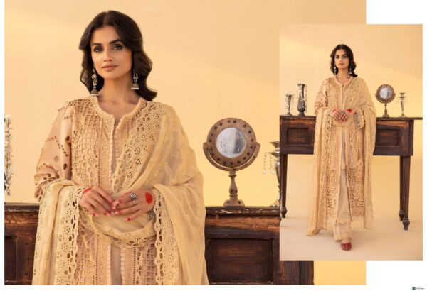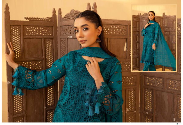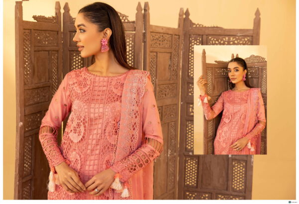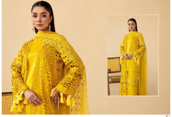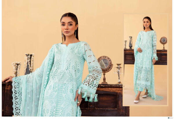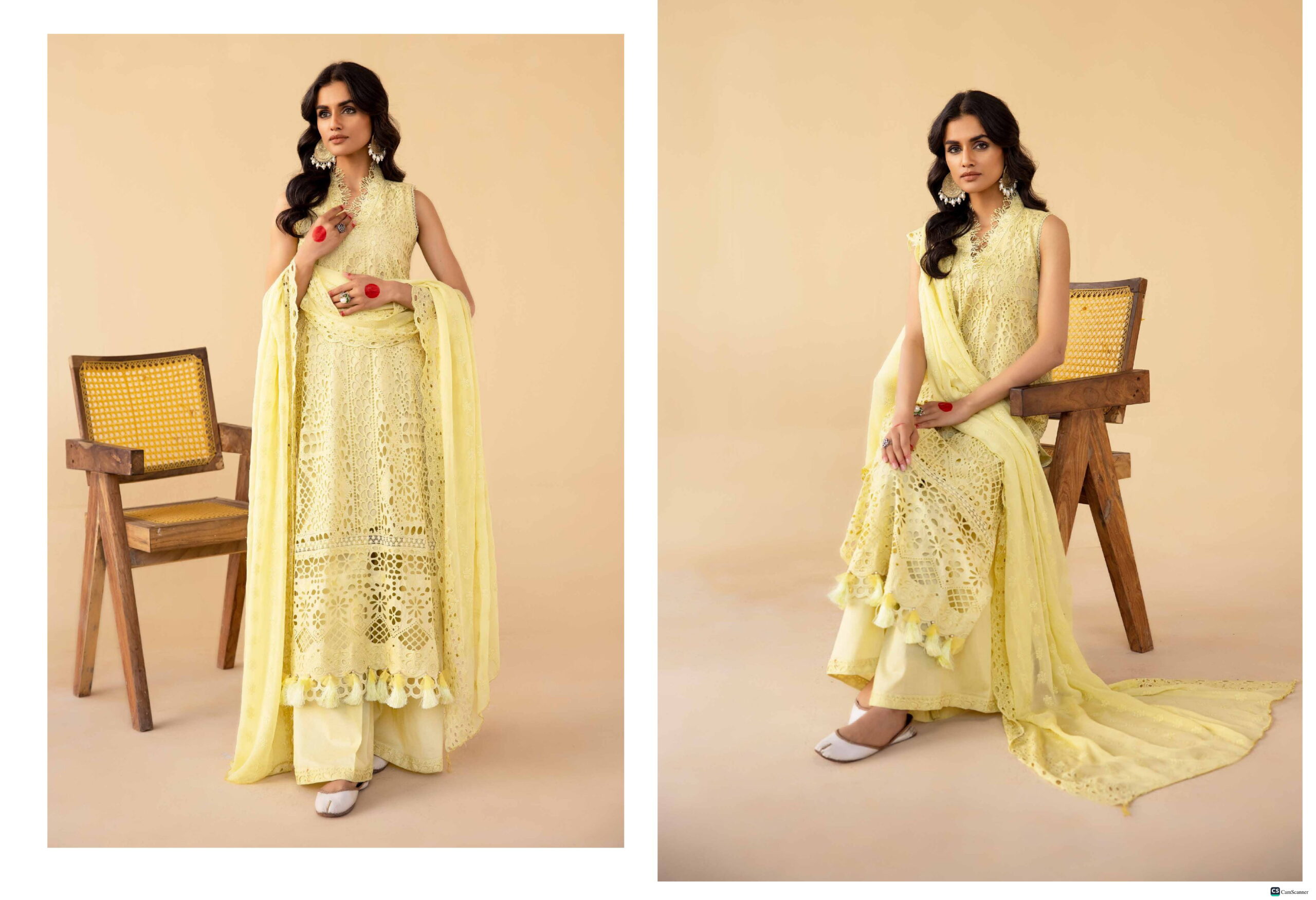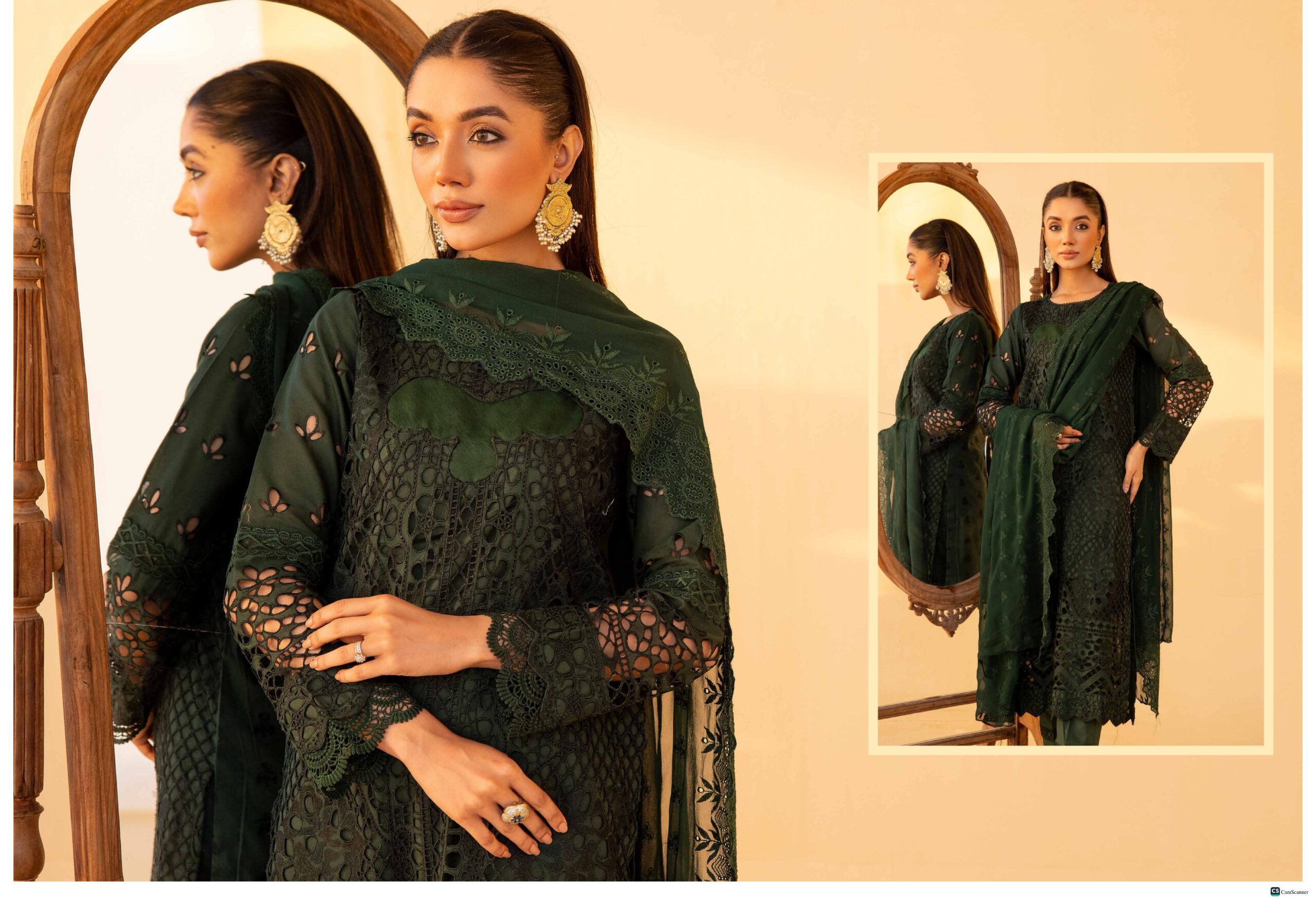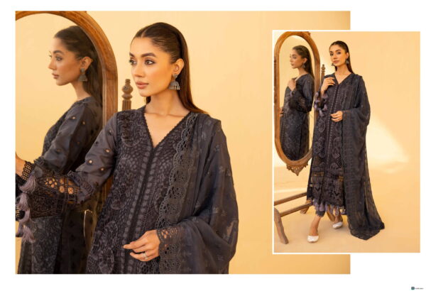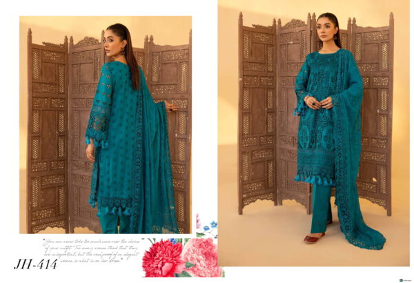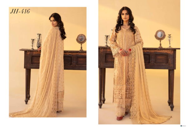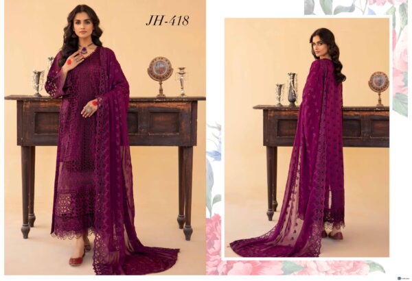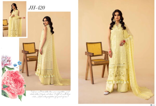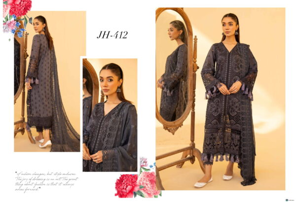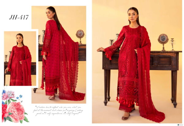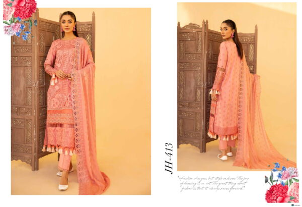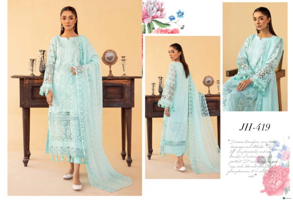 The Johra Zareena collection features unstitched 3-piece chikankari suits. A typical ensemble includes: